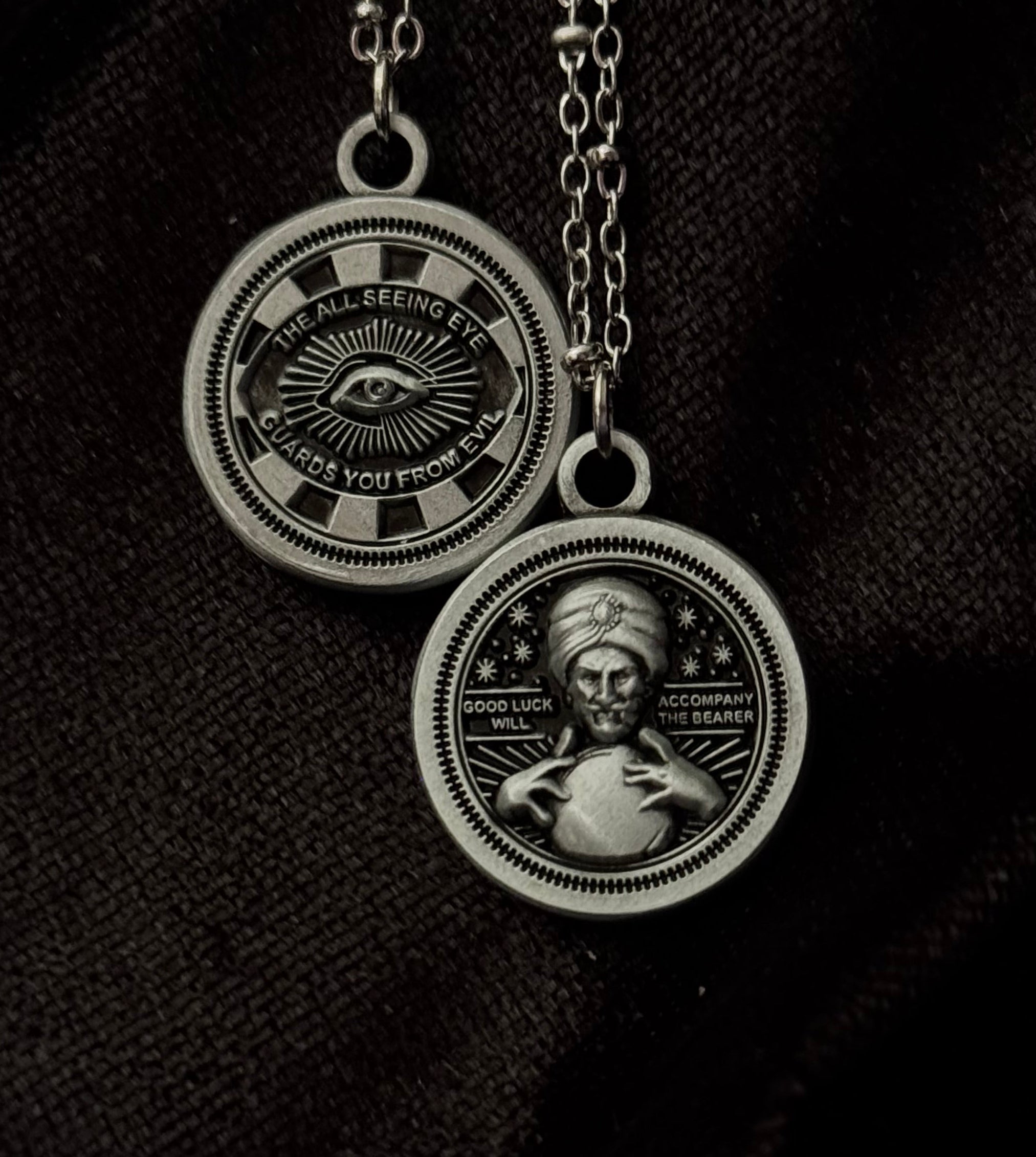 The other bears the all-seeing eye, a traditional ward against evil.