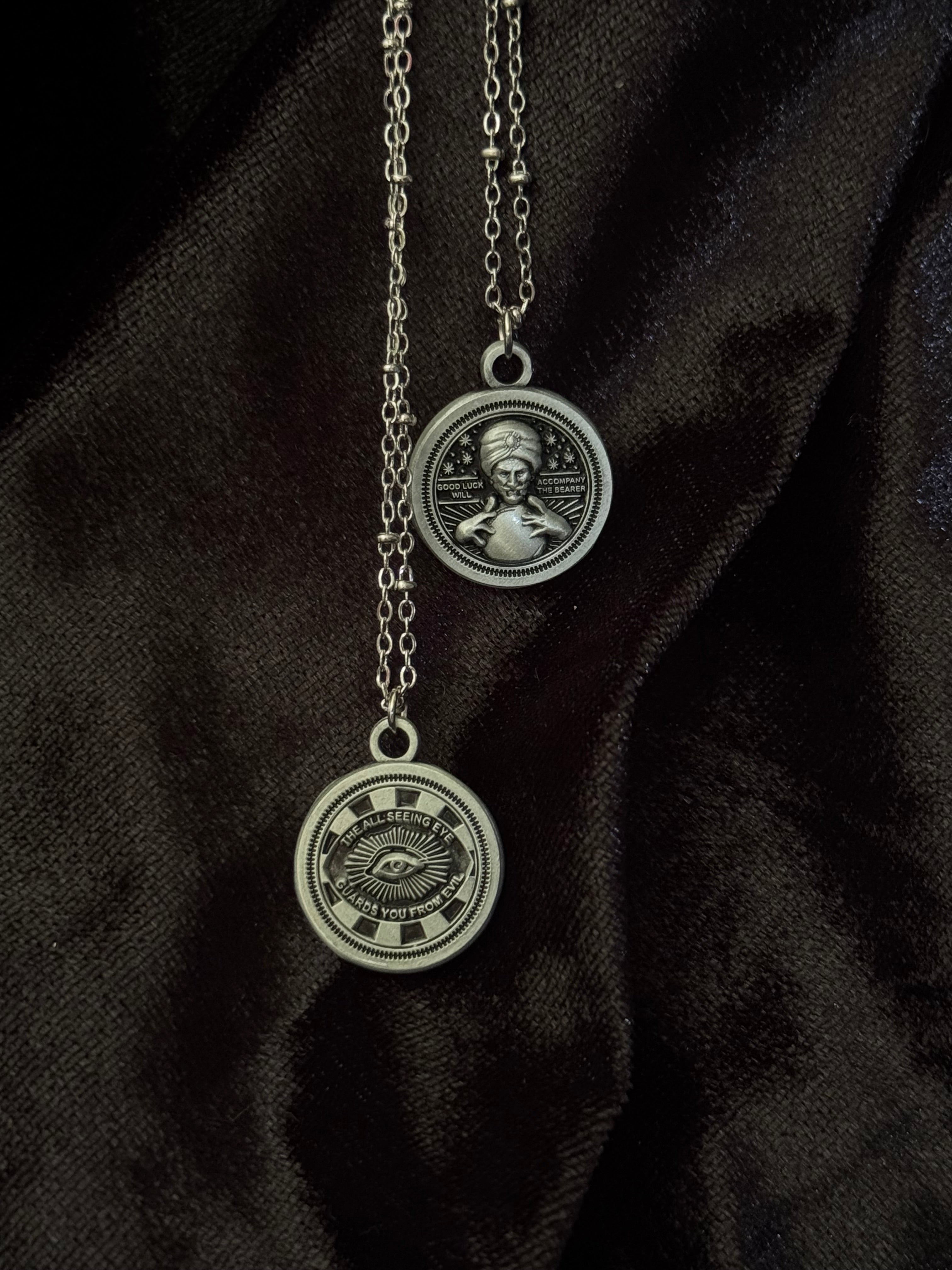 Inspired by Victorian funeral coins placed over the eyes of the dead—meant to seal the spirit and ensure safe passage. These coins echoed the same tokens once collected at fairs and fortune booths, stamped with promises of luck, protection, and fate.