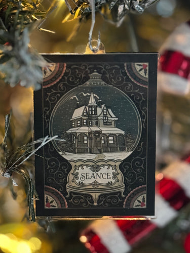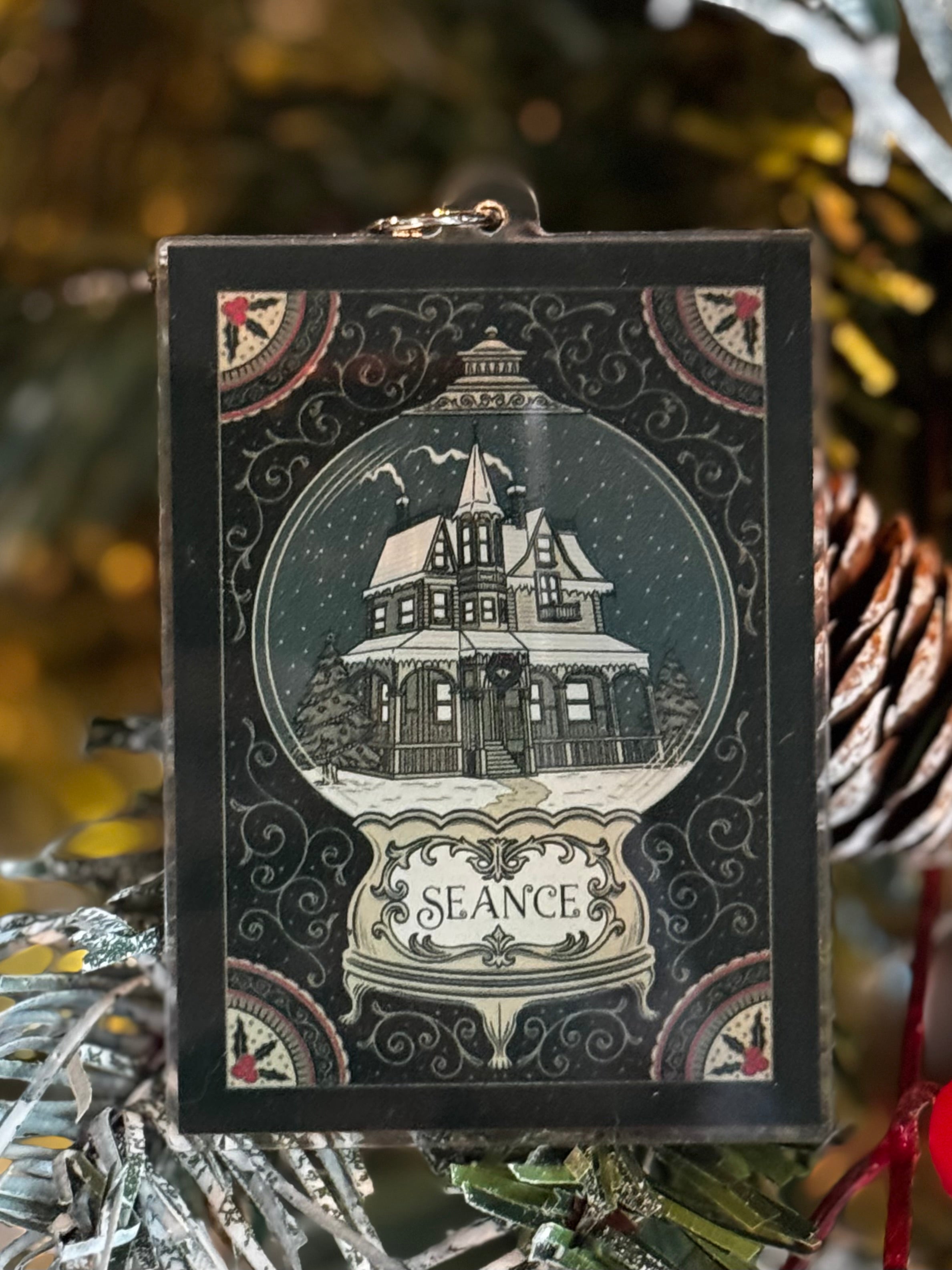 Haunted Holiday, tarot card style ornament. original artwork by Alfred Lawyer for Seance. 3 inch by 2inch. Comes on an ornament hook with a snowflake.