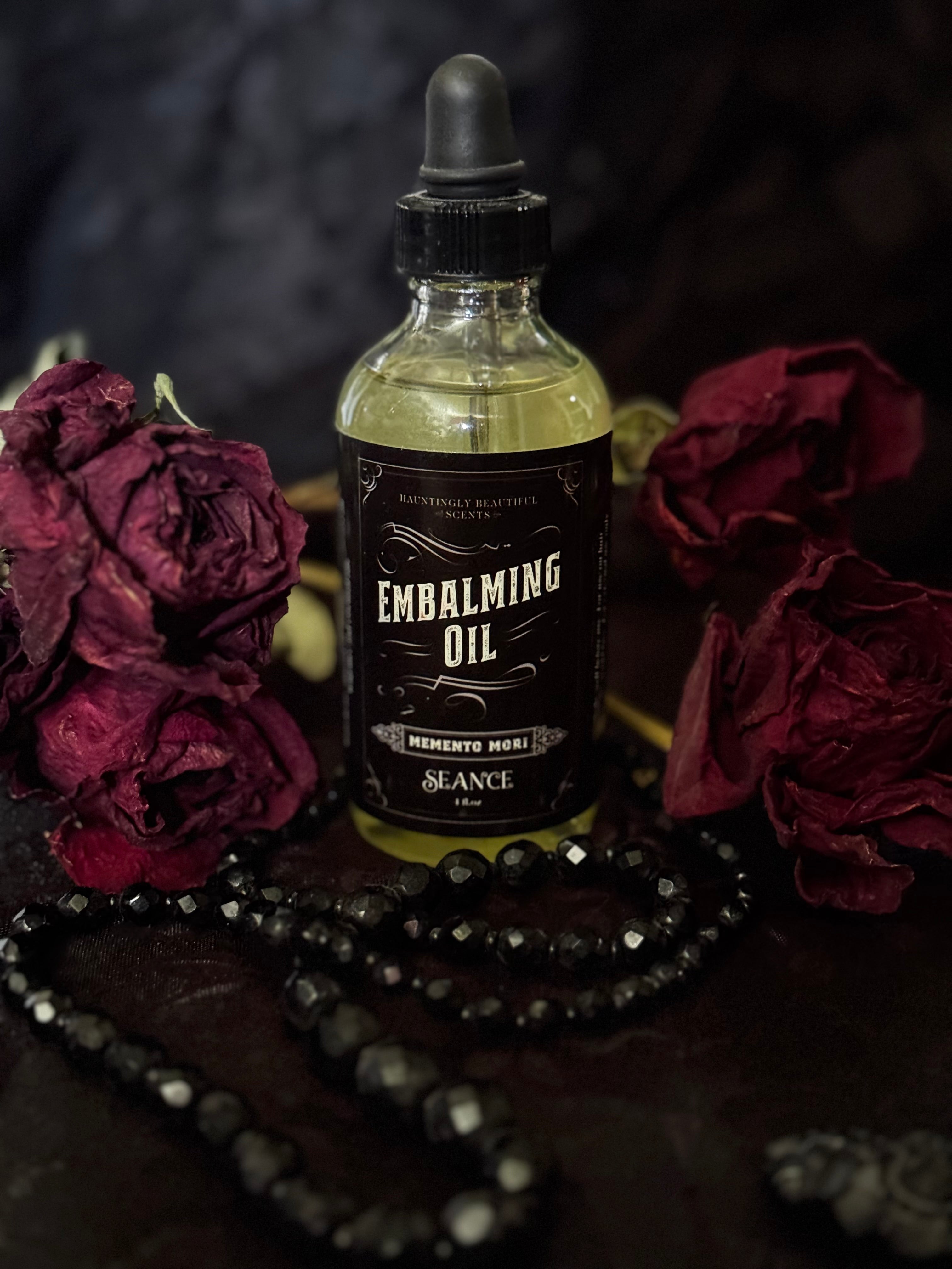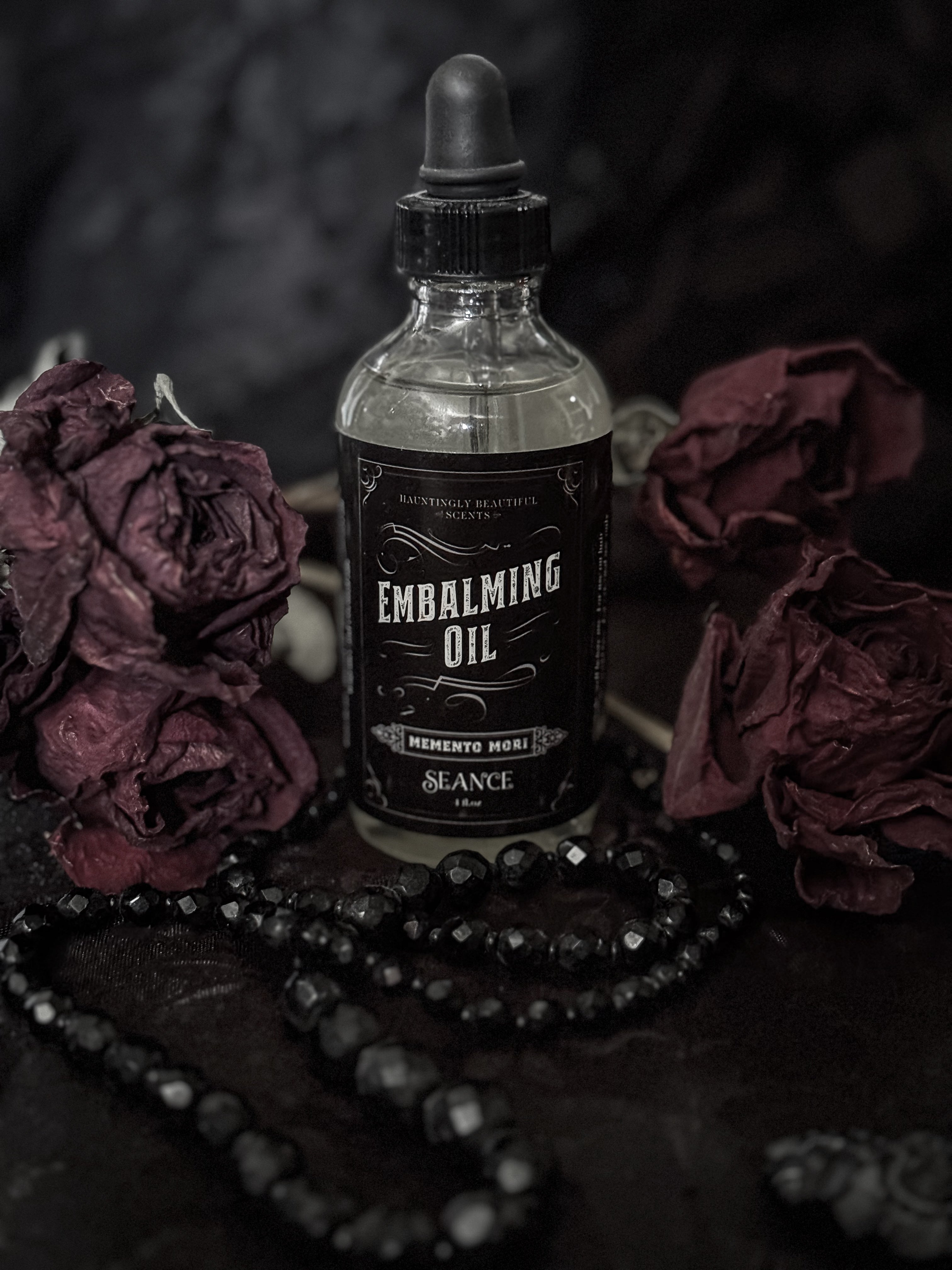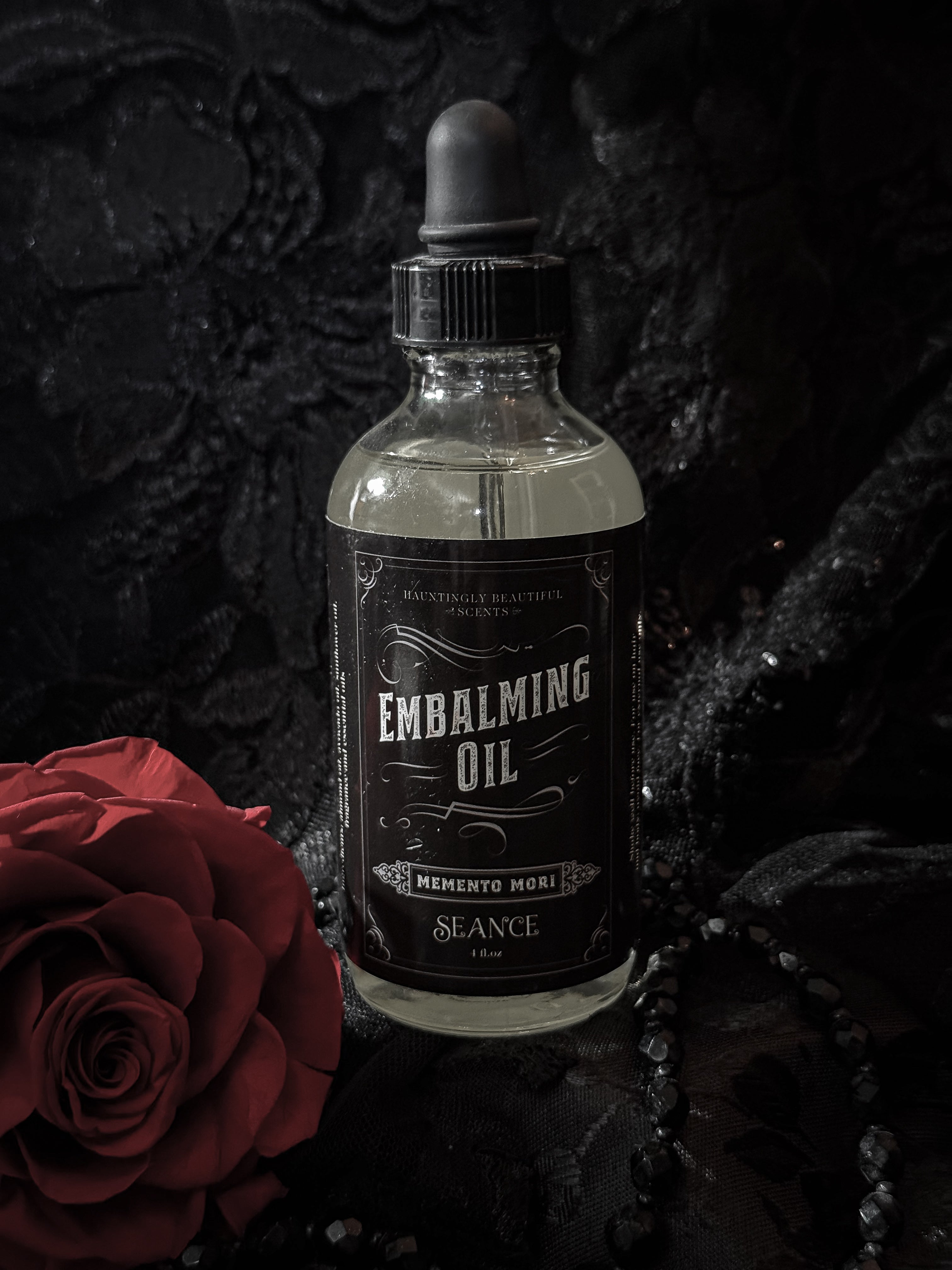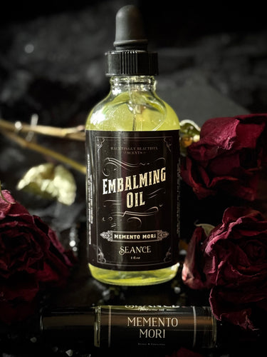 Our Embalming Oil is a concentrated lotion oil for body and hair. Made with top quality ingredients. Unlike traditional lotions this product contains only the essentials for your skin-  free of parabens, palm oils and harsh chemicals. Use this lotion to hydrate skin. It will absorb into your skin fully within 10 minutes, leaving you feeling silky soft- preserving your mortal beauty.