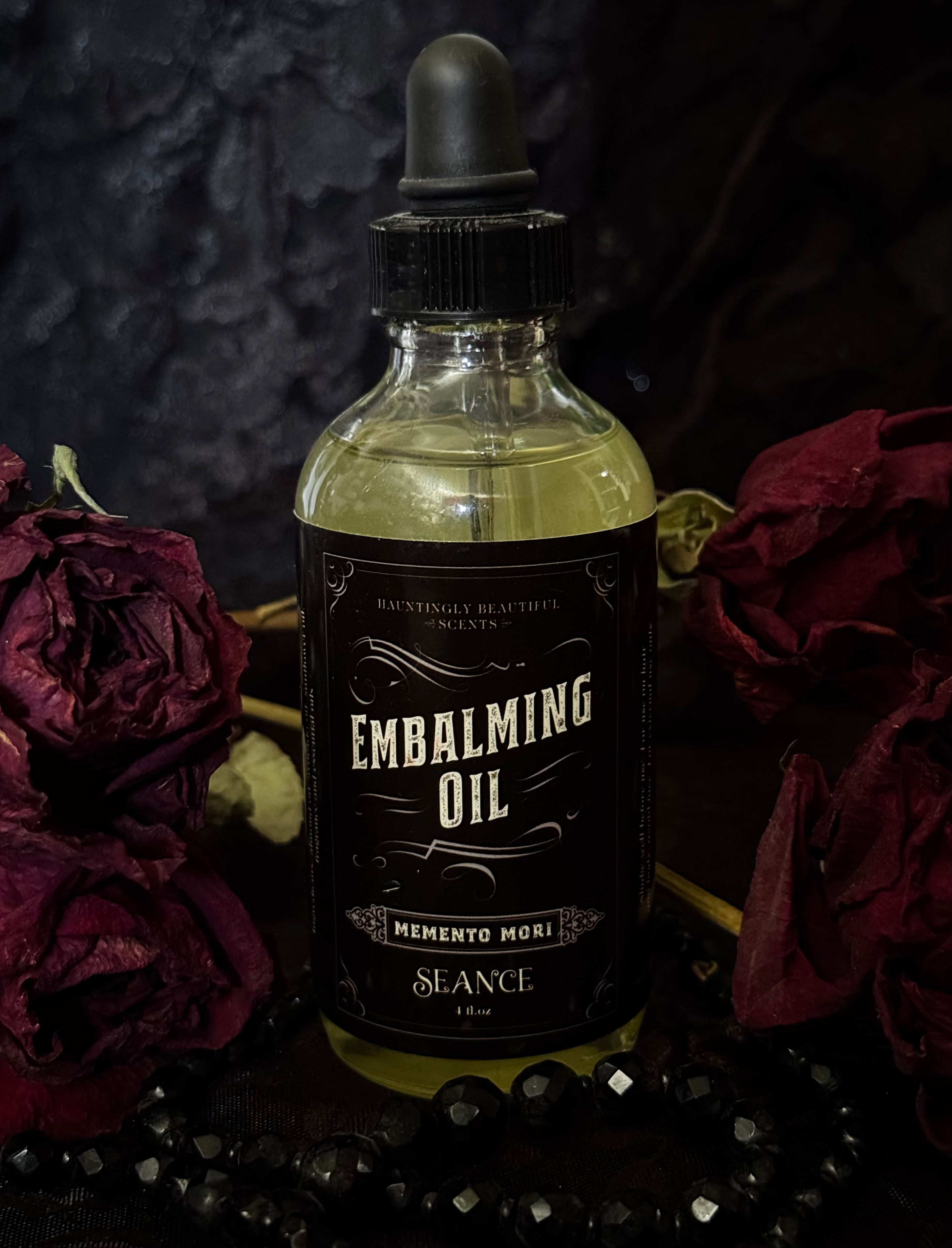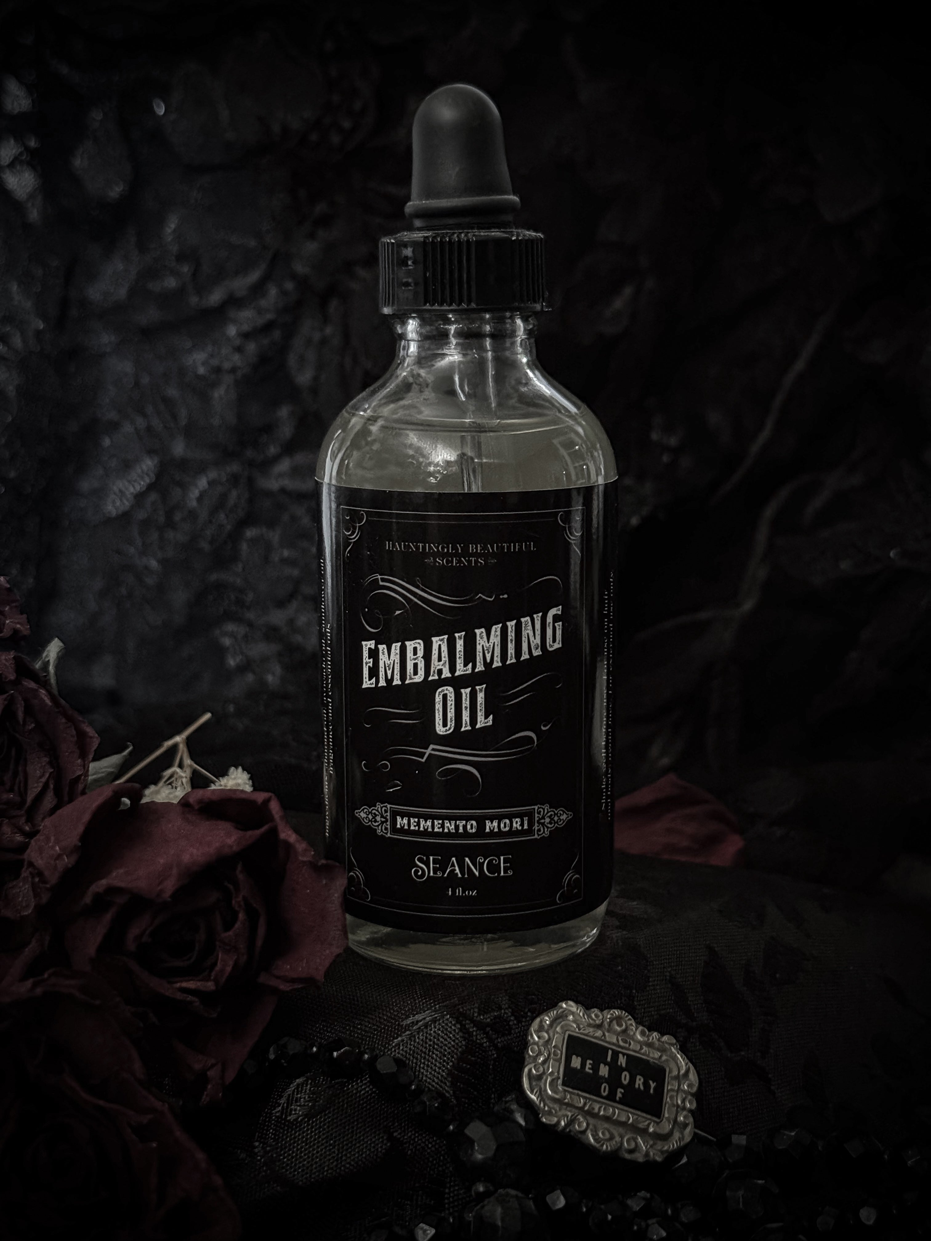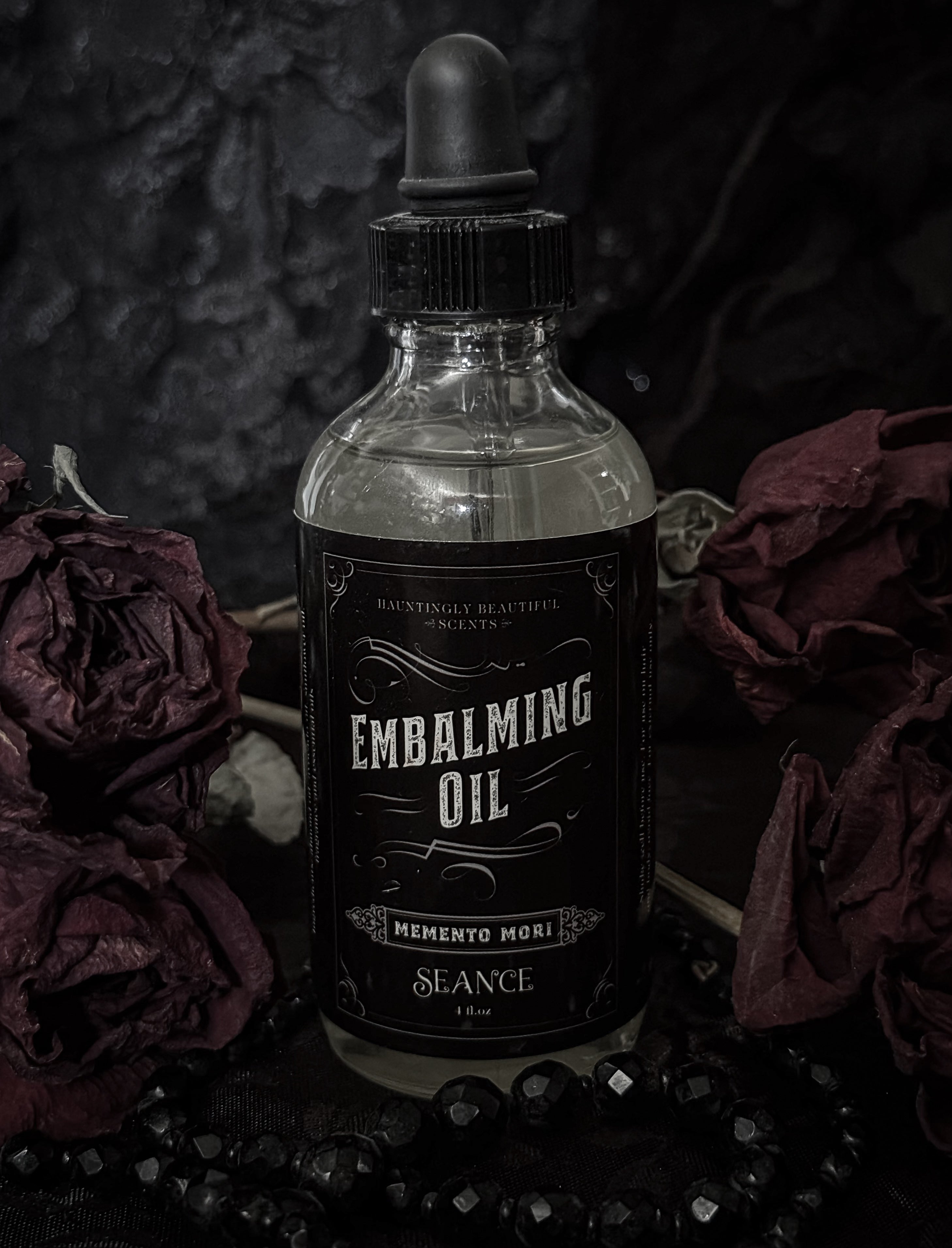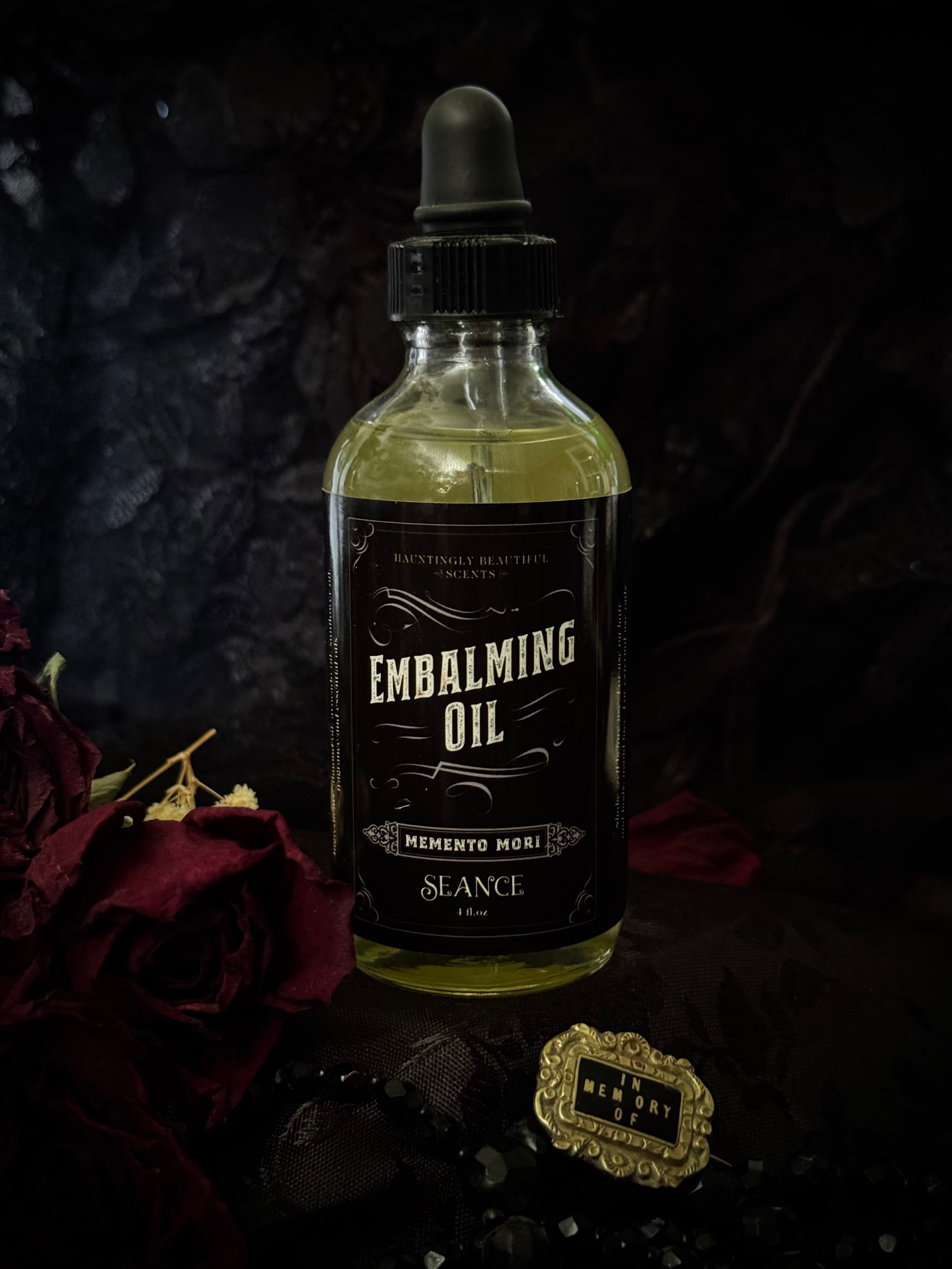 Our Embalming Oil is a concentrated lotion oil for body and hair. Made with top quality ingredients. Unlike traditional lotions this product contains only the essentials for your skin-  free of parabens, palm oils and harsh chemicals. Use this lotion to hydrate skin. It will absorb into your skin fully within 10 minutes, leaving you feeling silky soft- preserving your mortal beauty.