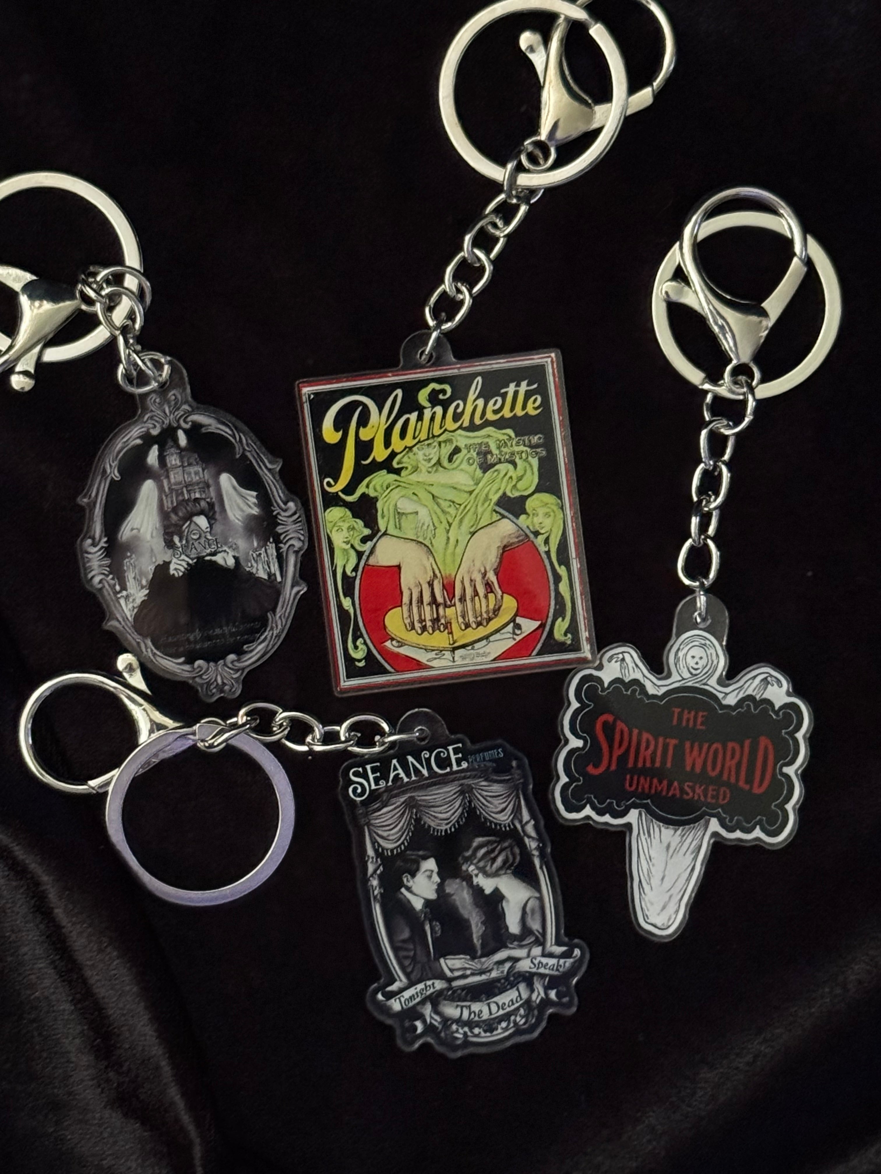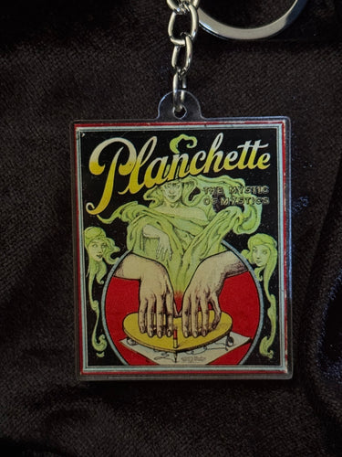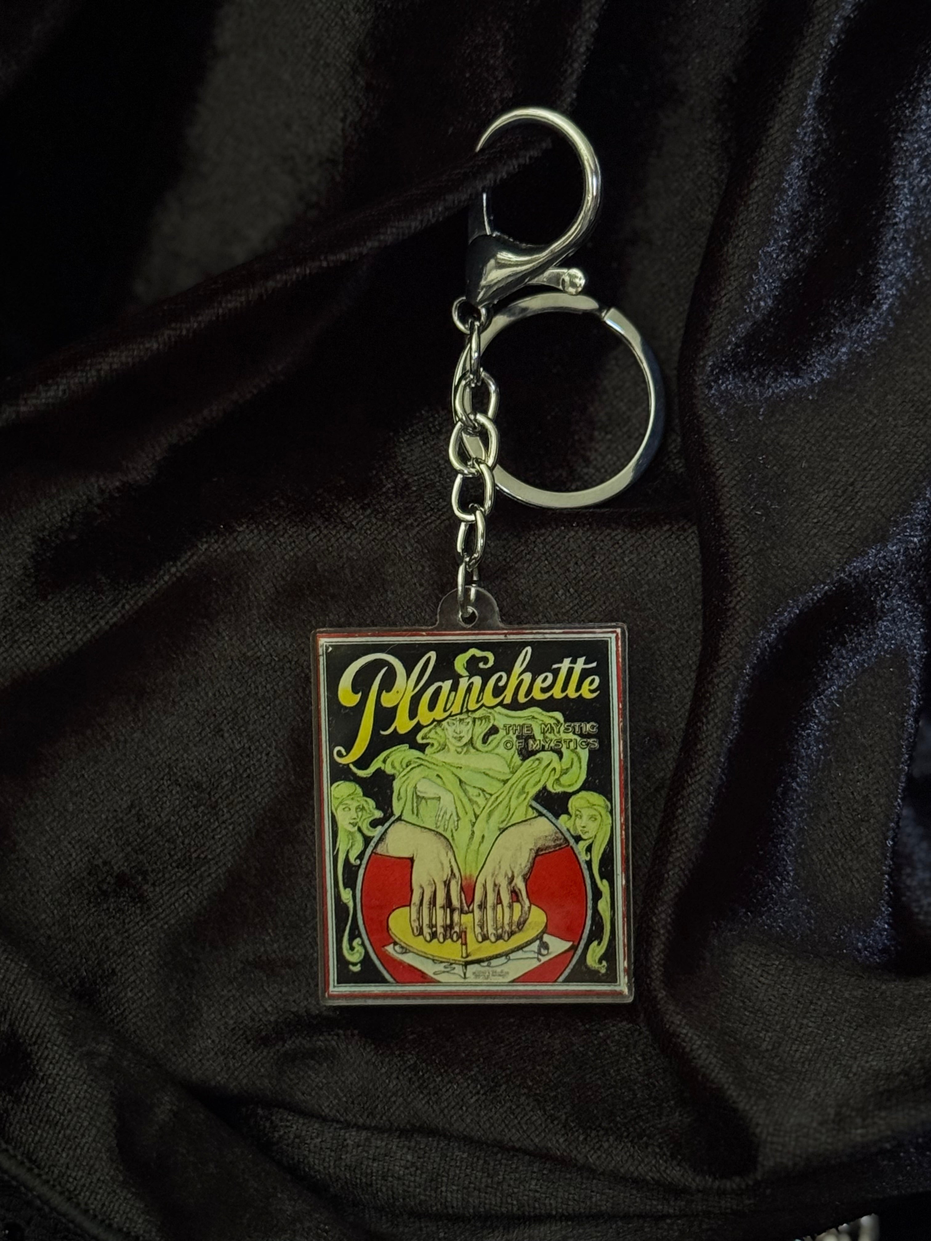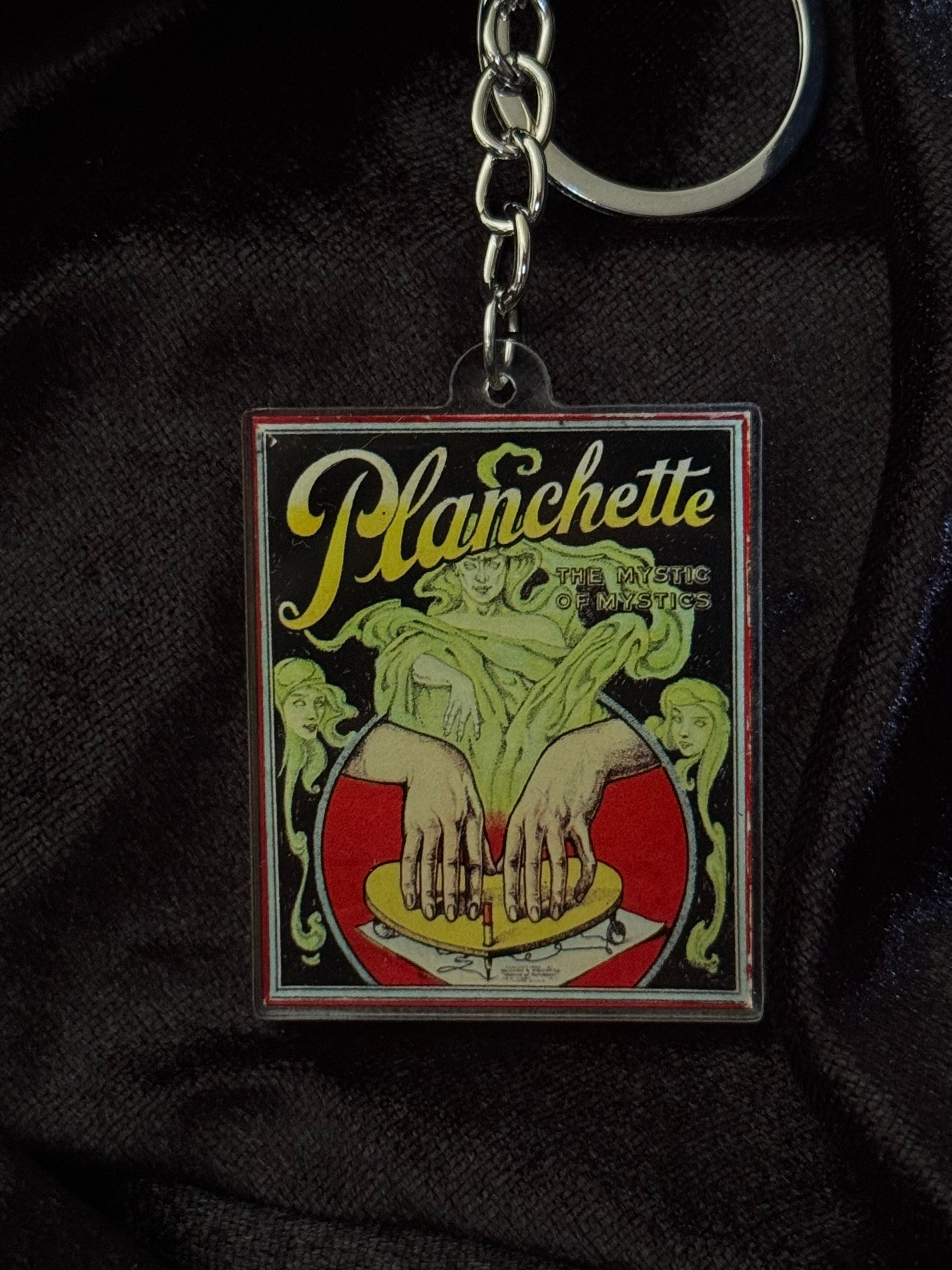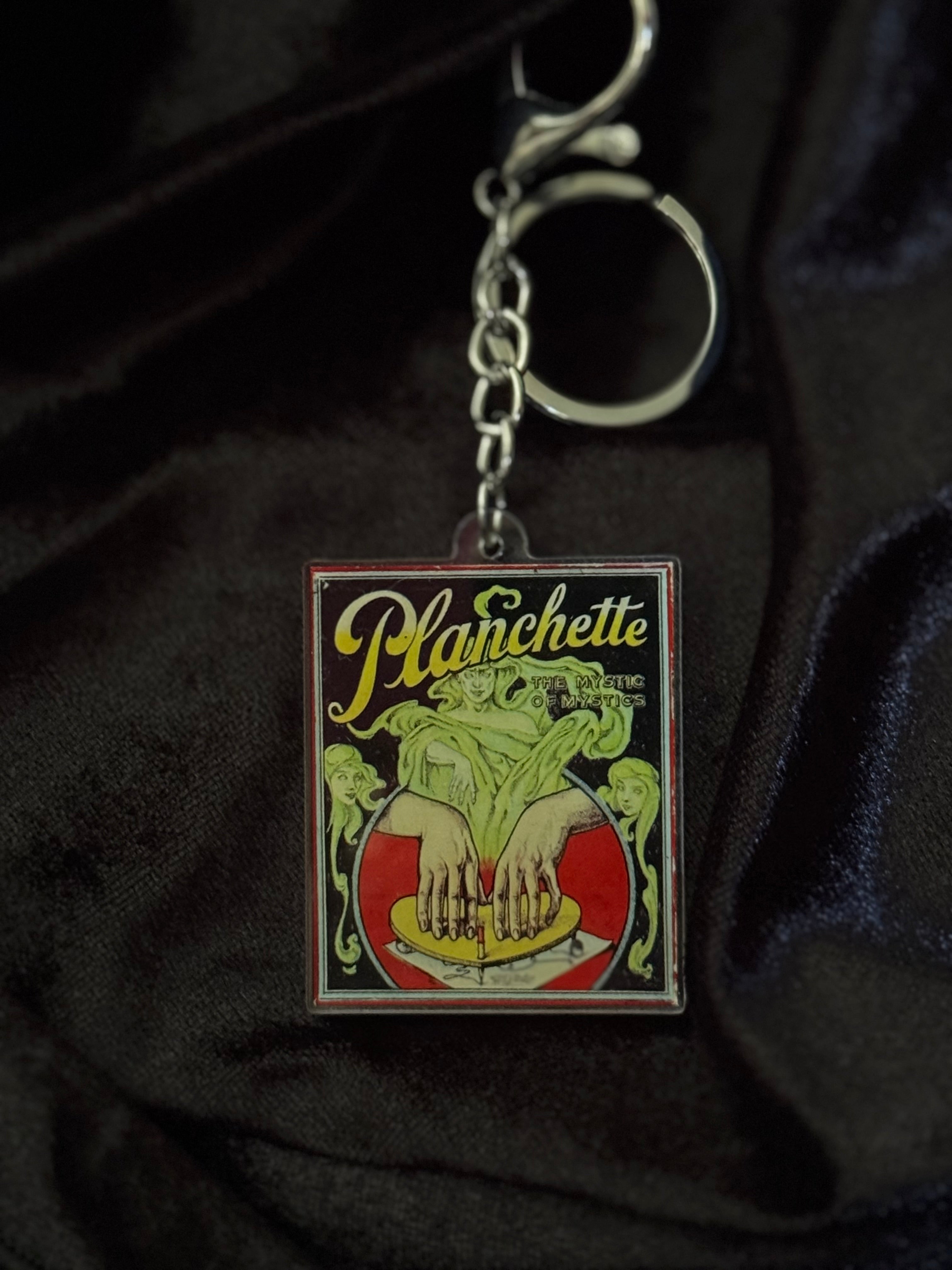 The Mysterious Planchette charm/keychain. Design is based off a Victorian Spiritualism advertisement.