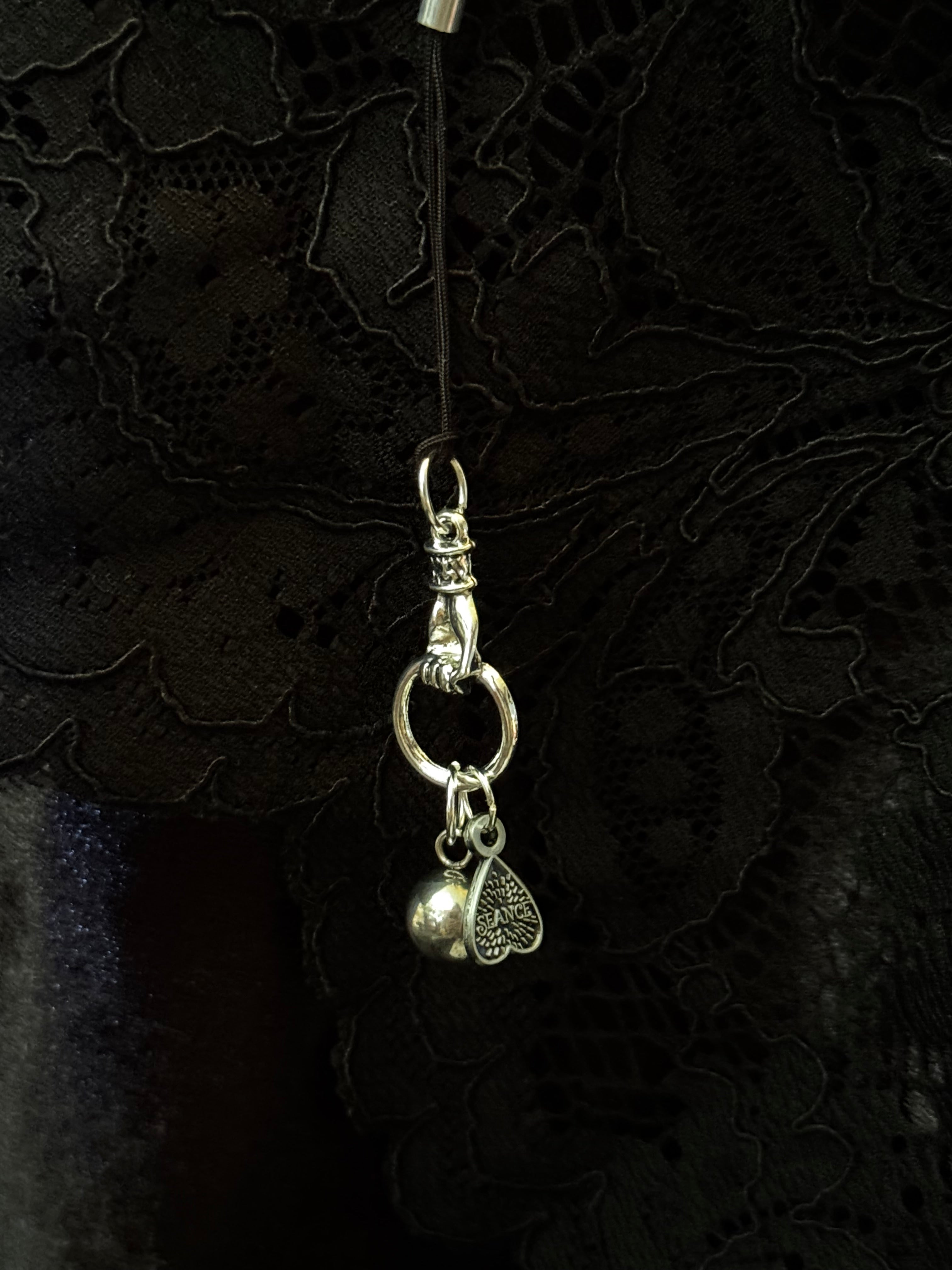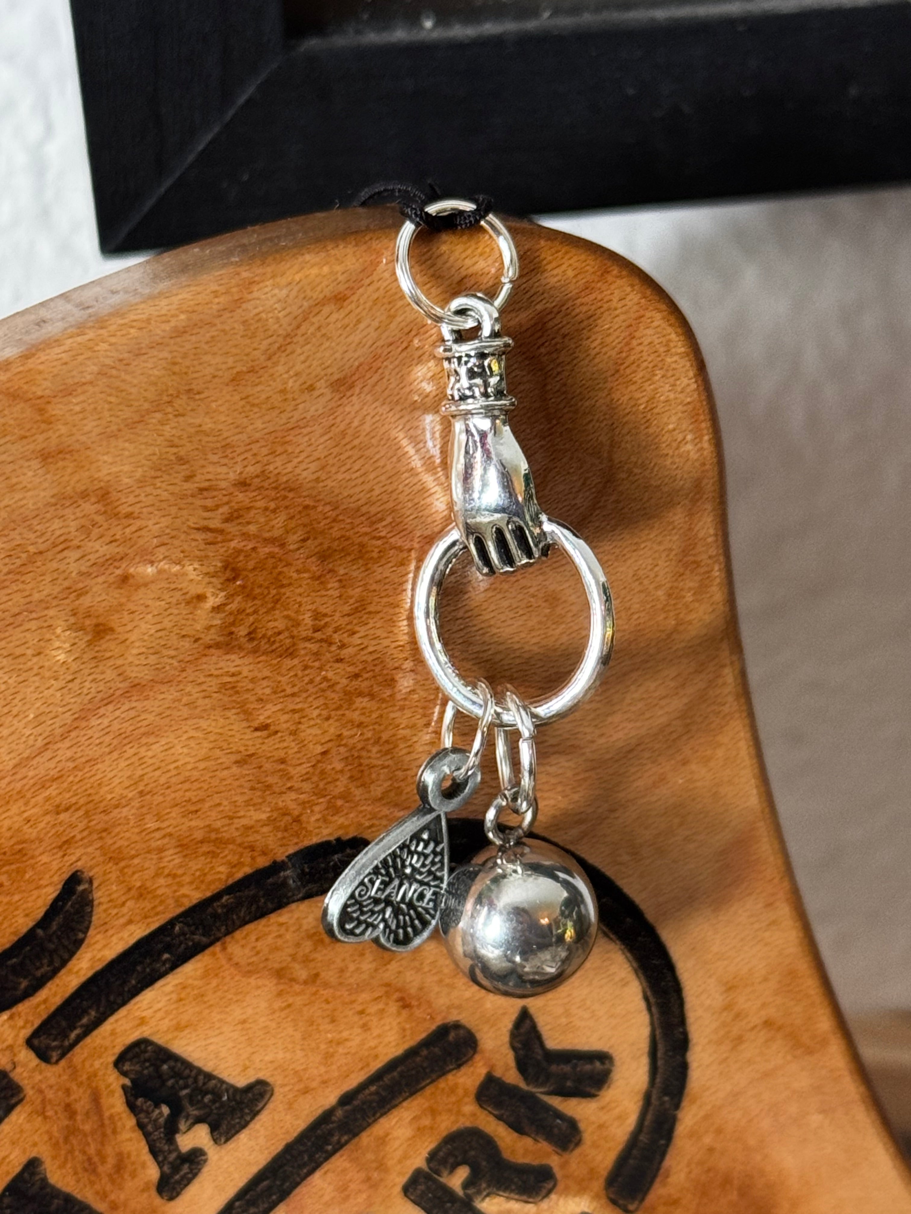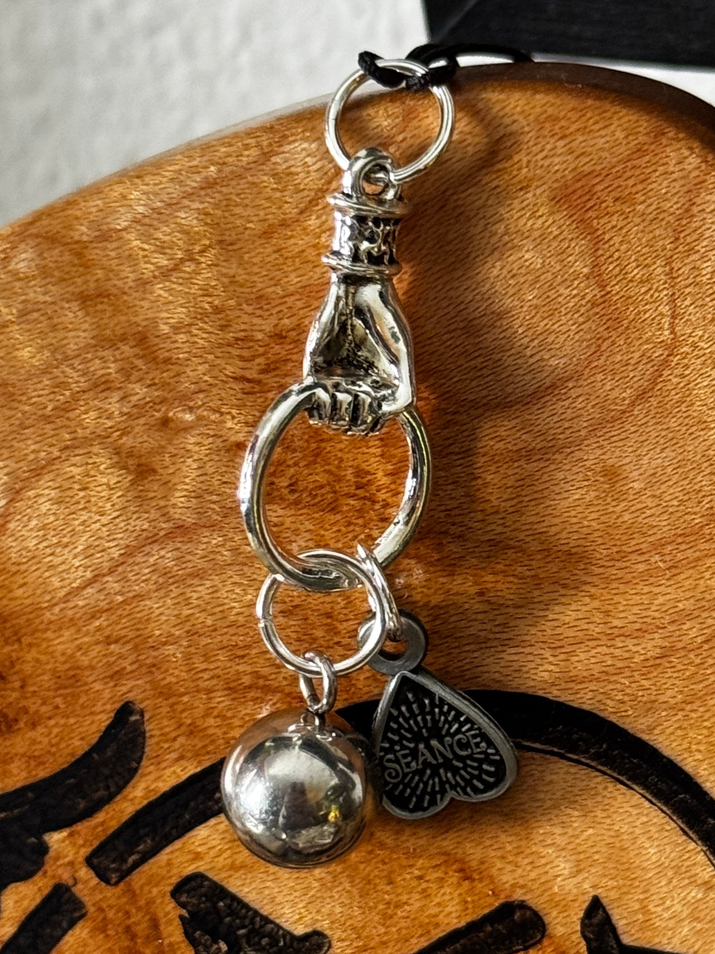 Victorian hand holding a crystal ball and Seance planchette.