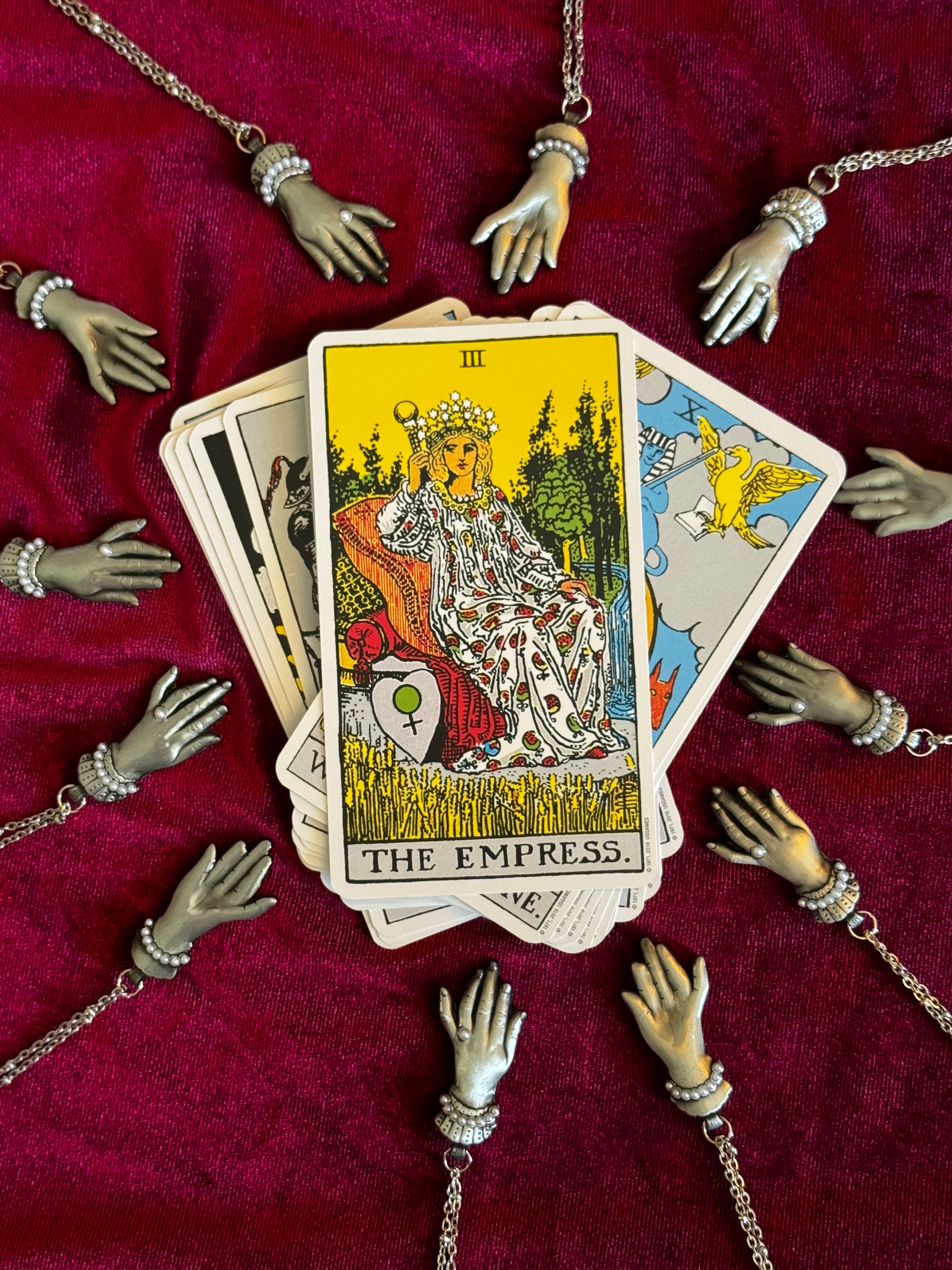 Victorians and the centuries before them used the hand as a symbolism in every day life. Whether worn on brooches, necklaces and mourning jewelry, to the cravings on gravestones - you will see variations of each ; all of them individually filled with their own symbolism. Greeting cards were often hands holding flowers that signified different meanings for each botanical beauty. Clasping hands was a symbol of meeting your loved ones in the afterlife. And of course used by many as the marking of the “seer” or any psychic & medium in the day.